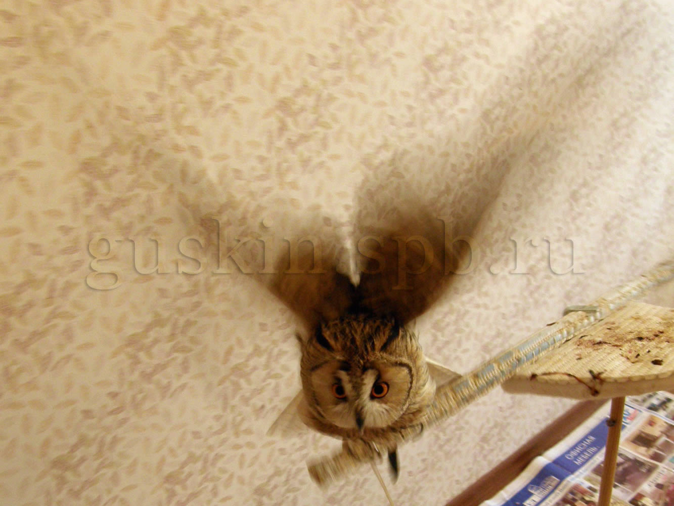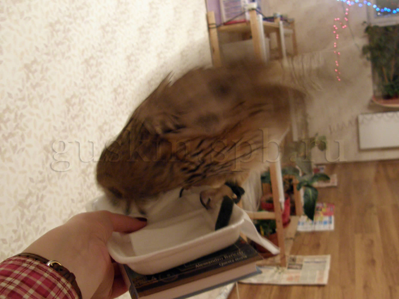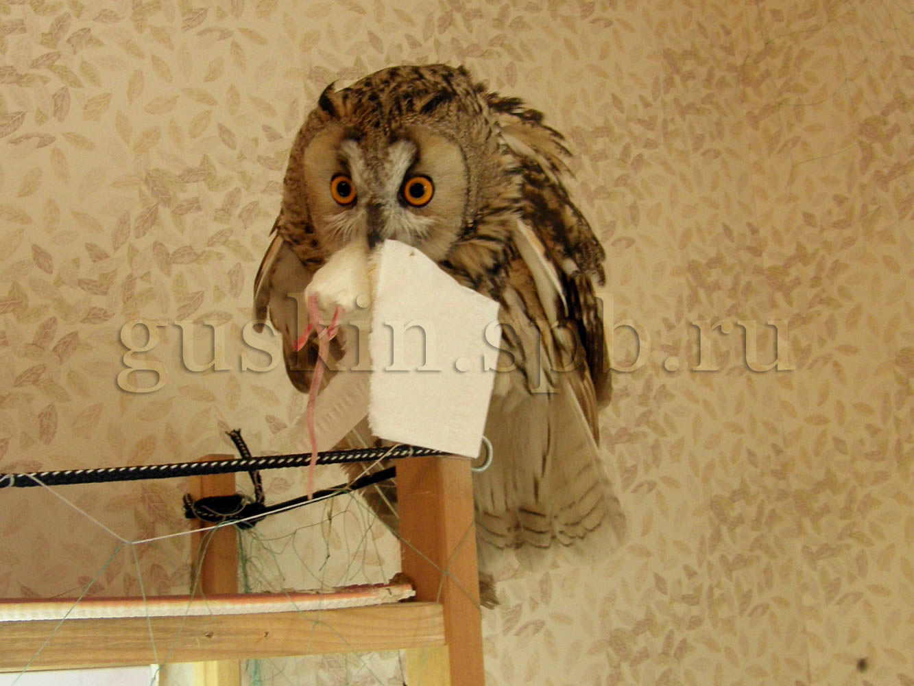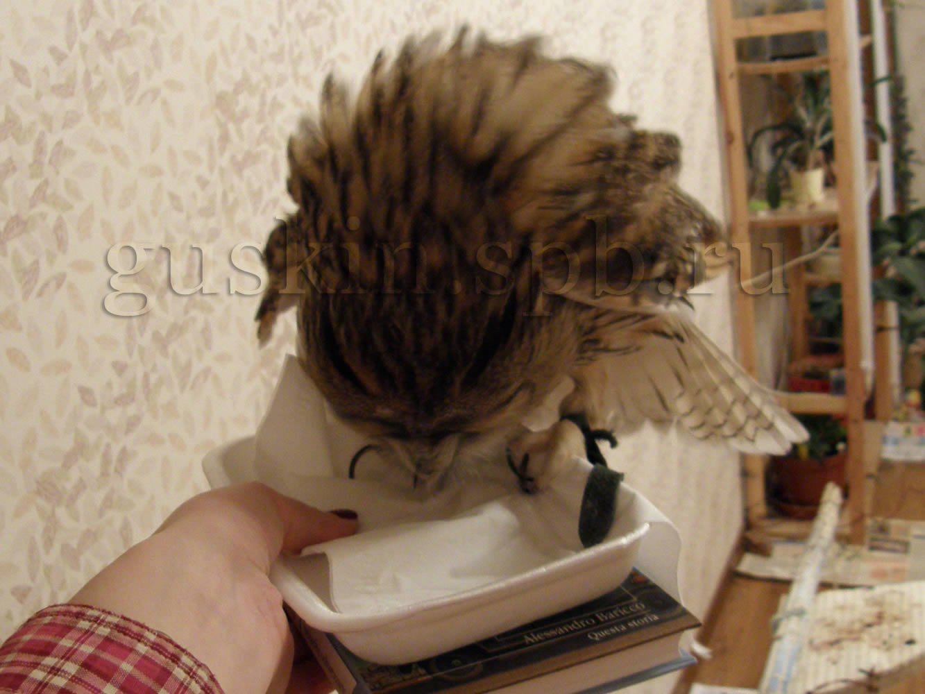 Анфисе это не грозит, потому что сам хозяева бывают дома, в основном, по ночам. Так что днём она дрыхнет где-нибудь, а оживляется к ужину. Примерно в пол-двенадцатого, с её точки зрения, вероятность ужина повышается, поэтому в 23:30 она усаживается на присаду и начинает ухать. Уханье слышно по всей квартире достаточно отчётливо. Иногда Анфиса, видимо, всё-таки слетает с присады, и тогда по квартире разносятся разные стуки и громыхания — это Анфиса громит комнату. В общем-то, спальня уже вполне приспособлена для её жизни и особо там громить нечего, но всё равно можно себя развлечь: сбрасывать с тумбочки шкатулки или летать по всей комнате с салфеткой, весело отрывая от неё кусочки.