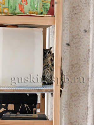 На этот раз перемирие затянулось: уже месяца два, как обе совы едят в комнате и не нападают друг на друга. Пульхерий питается на стеллаже, а Анфиса — у меня боком или даже на плече, что меня не очень радует. Оказалось, что не только в этом выразился прогресс в отношениях. Как известно, я цветовод-любитель, и большую часть мебели в квартире представляют собой стеллажи с подсветками. Соответственно, в комнатах всегда светло, в том числе, и в совиной. А уголков, где можно подремать днём «в тени» не так уж и много, и самый лакомый из них — за коробками с одеждой. Там подстелен коврик, специально чтобы совам было уютно сидеть, а коробки защищают от света. Проблема была только в том, что сидеть рядом совы категорически не хотели, так что кому-то приходилось довольствоваться не таким хорошим местечком. И вот однажды я зашла в комнату, огляделась, как обычно, в поисках сов, заприметила Анфису в тёмном застеллажном углу и... не смогла найти Пуха. Я посмотрела по верху мебели, на его любимых присадах, потом на не самых любимых, потом на совсем не любимых... Не было Пуха — и всё тут. Я придирчиво осмотрела сетку на окне — неужели выбрался?! Но сетка выглядела вполне надёжной. И вот когда я начала уже паниковать, Пух нашёлся...