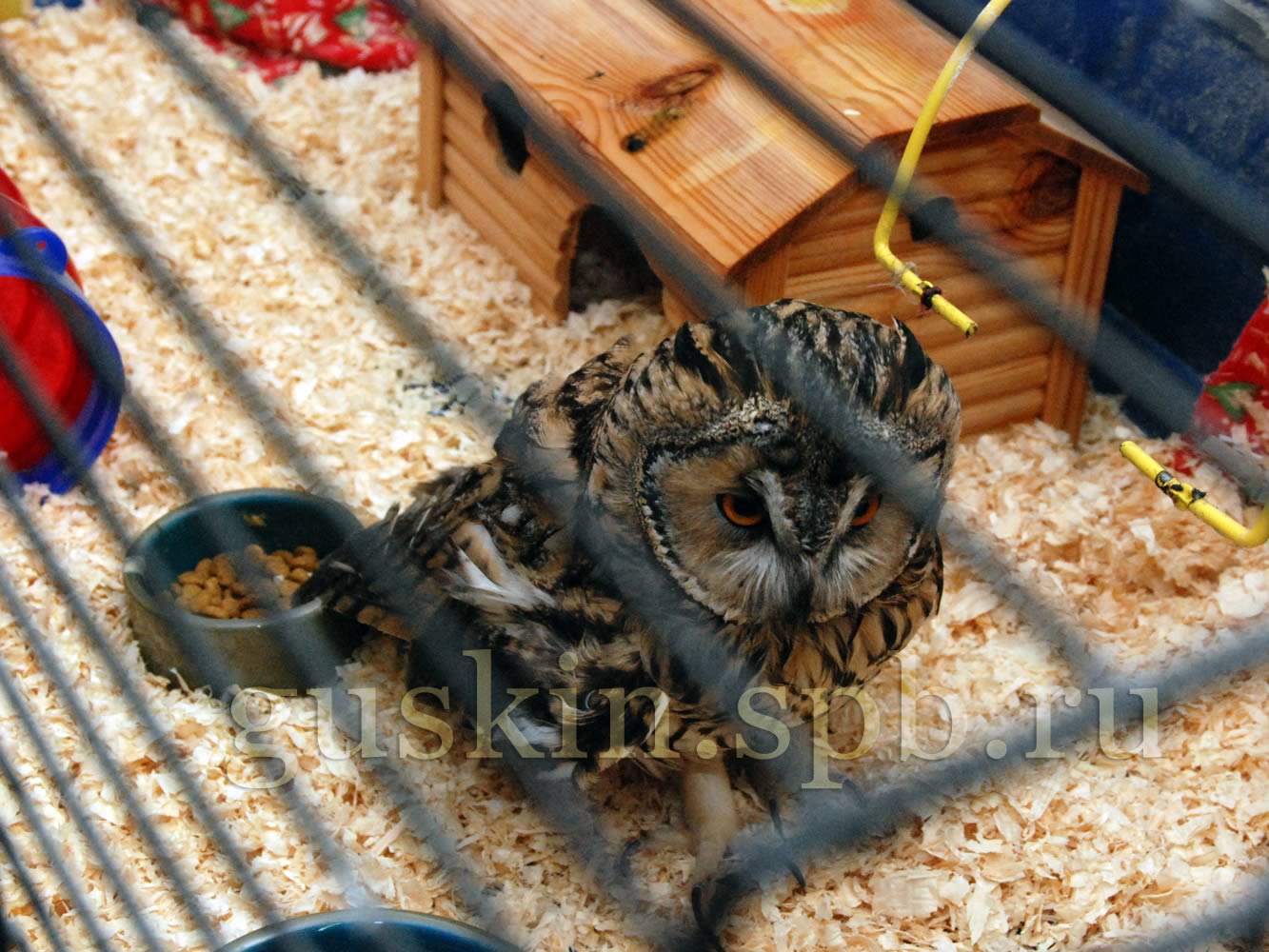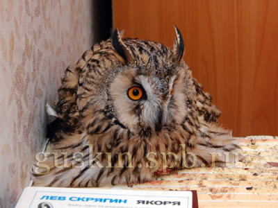 Его сомнения были не напрасны: хозяйка приюта Ксения сразу набросилась на него с кусачками и принялась подрезать клюв и когти (за что ей большое спасибо; я вообще почему-то боялась стричь клюв, а оказалось, не особо сложная процедура). Нам велели снять с птицы опутенки, чтобы он не повесился на ветках, — и вот Пульхерий уже на свободе! Так мы его и оставили — на полу, ужасно перепуганного, под присмотром двух местных опытных совушек. Анфиска приняла отъезд Пуха не без удовольствия. Признаться, она давно мечтала от него отдохнуть. На радостях она решила получше освоить доступную ей территорию и, дождавшись, когда я буду чистить ежиную клетку, взяла и залезла в неё. В углу клетки мирно спал под красной тряпочкой Петрович и не подозревал, что его клетку пытается оккупировать наглое пернатое.