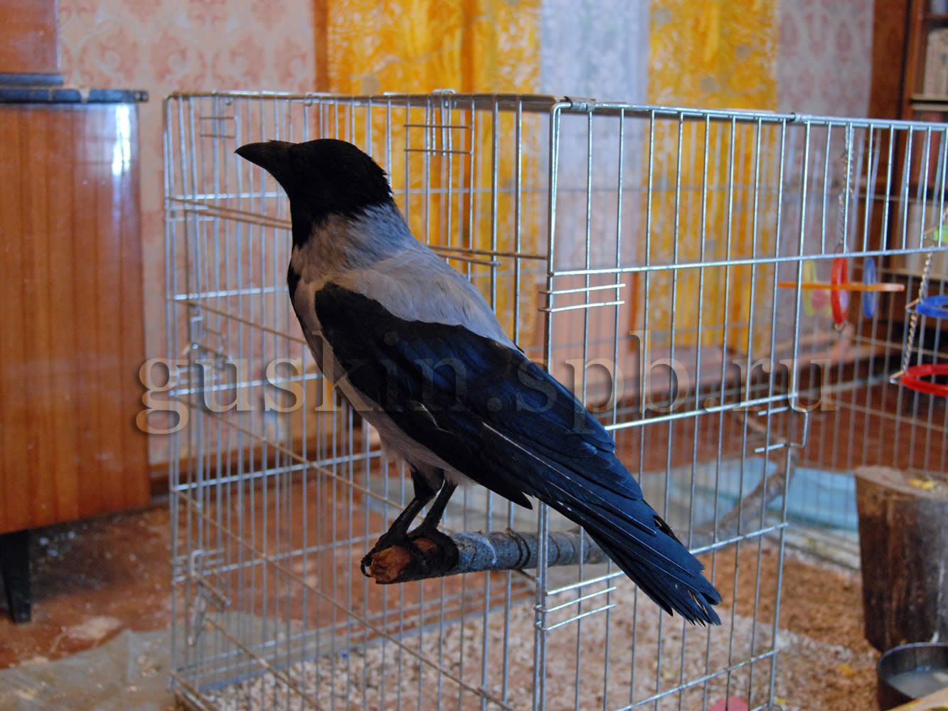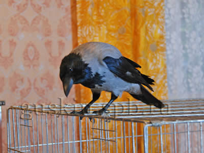Кстати о креветках: на Новый год Ксюша получила большую порцию креветок плюс половинку мышки с приветом от сов. Ксюша слегка ошалела от такого счастья. Выбрала, надо сказать, в первую очередь мышку. Потом уже перетаскала креветки, сколько смогла — съела, а остальное попрятала. Правда, к утру доела практически всё. Конечно, ещё не всё в вольере идеально: нужно ещё сделать дополнительные присады и поставить фанерные бортики, чтобы грязь не летела в комнату. Но уже стало просто чудесно; сделано специальное освещение и вся сетка аккуратно пришита. Сразу захотелось Ксюху фотографировать (раньше фоны были уж очень ужасны). Она очень любит сниматься, замечательно позирует — жаль, мне не удаётся застать её в сухом виде: она всё время плещется в тазике (поразительная чистюля!), и перо вечно мокрое, по крайней мере, на голове и грудке. Но это, конечно, вопрос времени, рано или поздно я подловлю момент и сниму её во всей её редкостной вороней красе. Так что вольер был удачной затеей: мы получили назад полкомнаты и любовь к Ксюше, а она — общение и возможность дразнить собак. Это ли не счастье? 11 января 2010