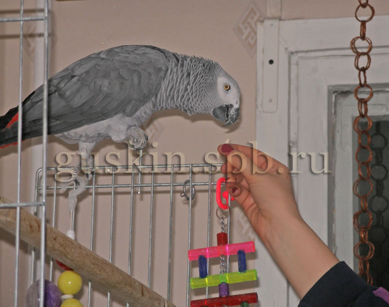 Новый питомец: Брут Приручение Брута Для каждого, кто покупает взрослого жако в магазине, приручение — очень, очень больная тема. Бруша оказался "клиентом" средней тяжести: очень осторожный, но не истеричный. Как результат — не такой уж быстрый прогресс, но и без ужасных воплей и тому подобного. К сожалению, многие владельцы мучаются со своими питомцами годами... нам, можно сказать, повезло. Сейчас Бруша, конечно, не ласковый, как котёнок, но он уже не так боится рук. Можно даже держать руки над ним (чуть в стороне) — например, вешая кормушку. Он не возражает. Он знает, что я не сделаю ему зла, но погладить разрешает только клюв и, иногда, макушечку. Чмокать же его можно куда угодно, и даже почёсывать носом. А самое большое счастье было — это когда Брут начал есть с рук. Произошло это примерно через полгода проживания у нас. То есть, брал он из пальцев семечки и раньше, но в какой-то момент начал делать это уверенно и всегда. Довольно быстро мы научились есть с ладони, а также ставить на ладонь одну лапку (чтобы не убежала!) и разжимать кулак, чтобы выковырять из него орешек. Иногда я даже рада, что мы не идём вперёд семимильными шагами... Чего приходится долго ждать, то воспринимается, как настоящее чудо. И мне сих пор кажется чудом, когда эта серая птица спускается по прутьям клетки ко мне, и я чмокаю её в макушечку. 16 мая 2006