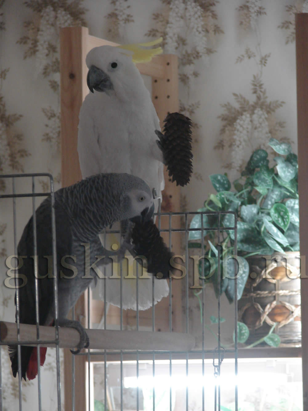 Ещё попугаи начали больше времени проводить в гостях: Брут насобачился спускаться в клетку к Чарлику и там хомячить те части корма, которые Чарлик посчитал несъедобными. А когда Чарлик у него в гостях, Бруша очень возмущается, если Чарлику дали игрушку, а ему нет. Например, Брут никогда особо не интересовался еловыми шишками. Но стоило дать шишку Чарльзу, как Бруше она немедленно понадобилась, и он полез с Чарликом из-за этой шишки драться. Пришлось и ему выдать шишку.