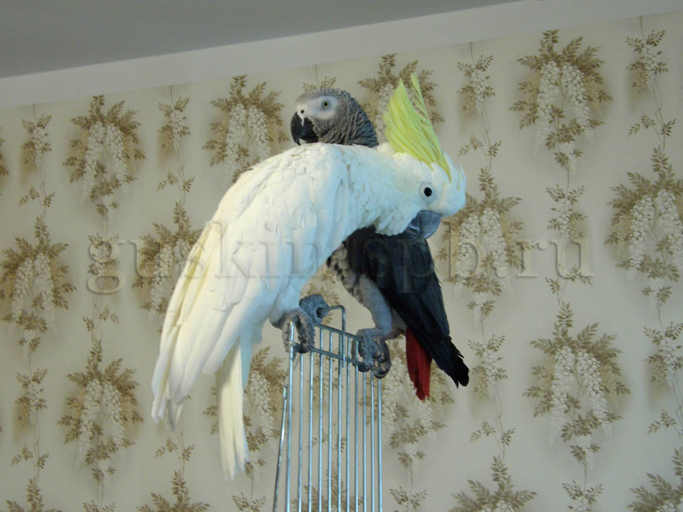 Когда попугаи летают друг к другу в гости, дело редко обходится без драки. Бруту явно не нравится Чарликов хохолок. Чарлику Брут не нравится целиком и полностью.