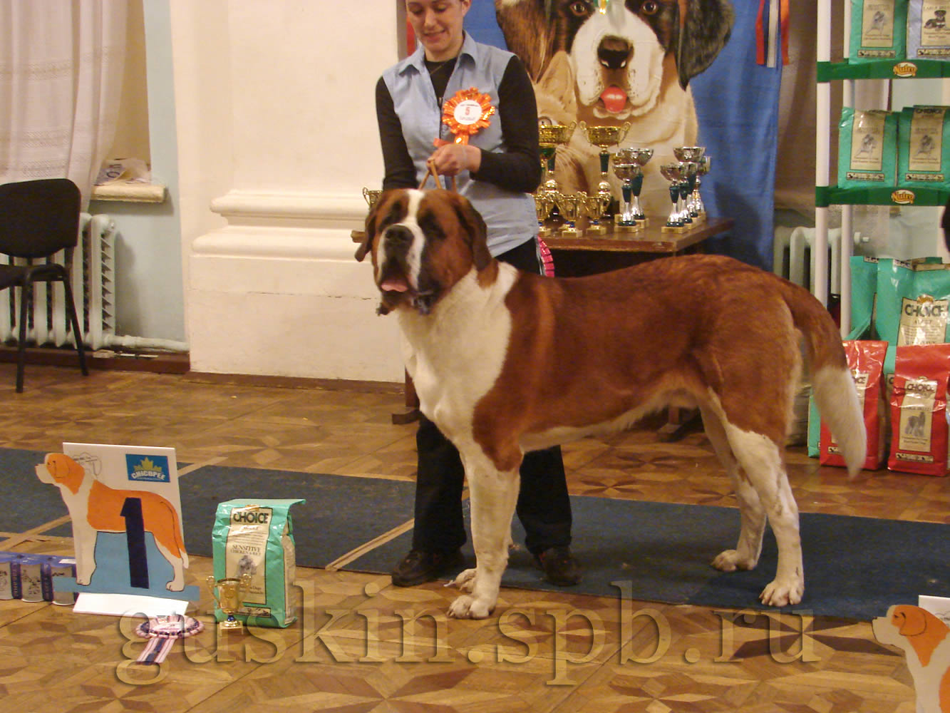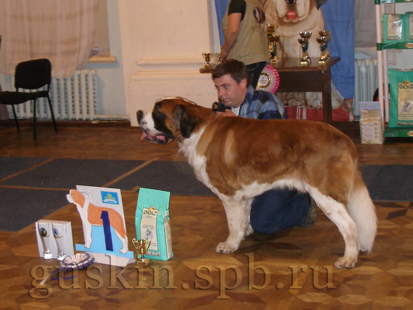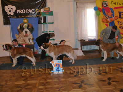 Это Ваня, Хин Сатори Бэст ин Шоу. Навилотош Гил Геллад в промежуточном классе — на фото Наташа прячется от него за стойку, чтобы Гил к ней не бросился, испортив всё дело. Ура! — наш папочка, Хин Сатори Антей Аристофан! Его выводит в ринг хозяйка, причём Антей феноменально спокоен, а хозяйка феноменально взволнована. К сожалению, Антей проиграл сравнение на лучшего кобеля Гилу. Но всё равно он был хорош! Навилотош Глори Гэлакси — промежуточный класс. Ионесси Царица Клеопатра, открытый класс — на фото получает специальный приз, и есть за что! Эту малышку привезли на выставку аж из Норильска! Дальше опять пошло интересное. Сравнение на ЛПП: в ринге Голден Гильдебрант, Гил и Беллисима — очень красивая собака, только мне морда черновата, а так — всё при ней. Но и конкуренты оппа-па! Кобели очень красиво держат стойку; Бэлла напоминает Винса тем, что уж если нельзя никуда идти, то уж головой крутить ей никто не помешает. Но выигрывает всё-таки Бэлла, и вот сейчас начнётся главное... Сравнение на победителя выставки! Две суки — Ванесса Вира и Беллисима.