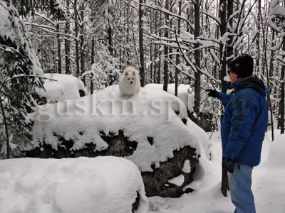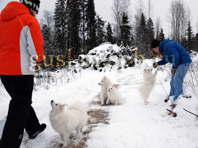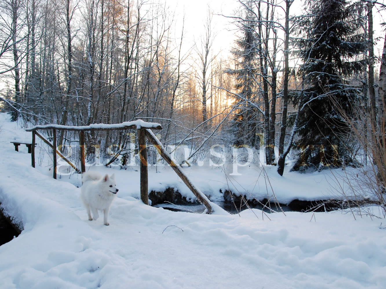Выйдя со двора, мы устроили маленькую фотосессию. К сожалению, собаки теряются на фоне снега, но мы очень старались! А потом началось настоящее раздолье. Собак отпустили с поводков, и Хелми тут же умчалась вдаль («Это самоед, — сказала Сюзанна. — Японский шпиц никогда бы не убежал так далеко»), а шпицы бегали друг за другом, и Белка наконец-то начала осваиваться в своей родной семье — Agrarium family. Дав собакам побегать, решили сфотографировать их вместе. Однако попытки усадить всех рядком не увенчались успехом: во-первых, Белка предпочитала держаться в сторонке, а во-вторых, в каждый момент сидели максимум три собаки, а четвёртая... впрочем, смотрите сами. Когда же удалось всех усадить, красоты всё равно не получилось: собаки сели далеко друг от друга и отвлекались на блеяние, доносившееся с участка неподалёку. Только Хелми с Эстери, как старые знакомые, прижались друг у другу. Тогда мы решили не мучиться, а просто взять собак на руки. И получилось ещё лучше — ведь в кадре оказались и хозяева!