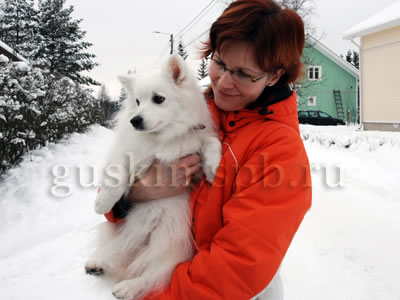 Перед отъездом, по просьбе Сюзанны, мы устроили фотосессию для щенков. Сюзанна причесала каждого щеночка, хотя, как мне кажется, они и так были отлично причёсаны. Слава же не терял времени даром и тискал Хелми. Хелми — компромисс между огромным Винсом и малышкой-Белкой, и Слава в неё просто влюбился. Впрочем, он с самого начала хотел самоеда и согласился на японского шпица только в свете того, что самоед великоват для работы в офисе. Щенки на фото получились — любо-дорого посмотреть. Само наивное очарование — и девчонки, и единственный мальчишка (кстати, у Белочки тоже один-единственный братик). Чем ближе я с ними знакомилась, тем больше они мне нравились! Сюзанна утешила меня тем, что я всегда могу купить у неё щенка — если только захочу. Ох, боюсь, что захочу... Особенно милым карапузом выглядела Agrarium Special Star — единственный щенок S-помёта, на 4 дня младше своих молочных сестёр и братика.
