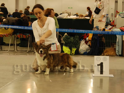 На второй день ринги действительно совпали с корги. Но Вика поспела всюду: получила для корги ЛЮ, чуть не получила ЛПП — а потом прибежала выигрывать CACIB с Белочкой. Мы в её отсутствие времени не теряли и даже немного потренировались в сободном ринге. Белочка уже здорово выучила всё, что нужно делать, и даже на столе не боится стоять, и экспертов не шарахается. Экспертиза же прошла полностью по сценарию первого дня. Когда Белка получила CACIB, я выскочила её пофотографировать, после чего Белка плохо повела себя при сравнении на ЛПП. Вика очень меня ругала. Но я была уверена, что мы проиграем сравнение, и даже не заморачивалась этой проблемой.