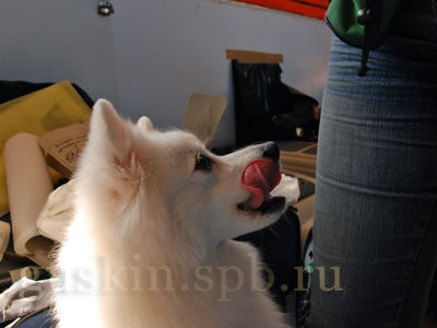 Вернулись мы к столу, встали в стойку, а что-то описание нам давать не торопятся: какие-то были заморочки с ринговой бригадой. И вот стоим мы в стойке, судья на нас поглядывает, а описание всё никак не начнёт. А поскольку Белка уже к тому моменту здорово настоялась, она всё норовила сесть или встать на задние лапы, чтобы достать у меня из кулака вкусняшку. Время от время я потихоньку её подкармливала, когда судья не видела.