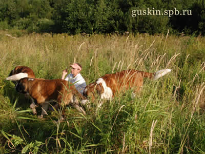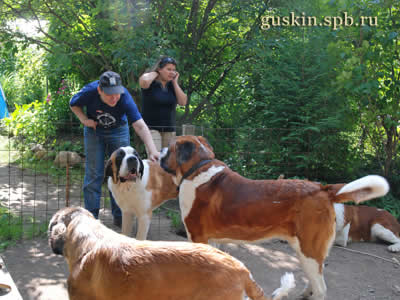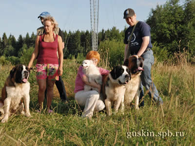 Конечно же, в конце обязательно нужно было сделать групповой портрет. Всего на Дне рождения Наташи присутствовало 11 сенбернаров — есть на что полюбоваться. Стали усаживать собак в ряд. Винс понял, что девушки в ближайшее время никуда не денутся, и решил воспользоваться случаем и... прилечь. Слава его тянет за ошейник вверх, а Винс заваливается в траву. Винс победил; для фотографирования он предоставил нам только мокрое белое брюхо. Однако Славе удалось достучаться до Винсовой ранее никогда не использовавшейся совести. Винсик согласился посидеть в общем ряду. Белка крутилась около меня, но, увидев, что фотографируют, потребовала, чтобы её тоже взяли в компанию! Конечно, её призыв был услышан: Валерия Павловна немедленно взяла Белочку на ручки. Так Белка снова стала самым сенбернарским в мире японским шпицем. Ну а напоследок вся сенбернарская семья, конечно же, фотографировалась с именинницей, Наташей Озерянской, руководителем питомника Навилотош. Вот такой получился букет из собак (украшенный Белочкой, как торт ягодкой) – с Днём рождения, Наташа! 11 августа 2009