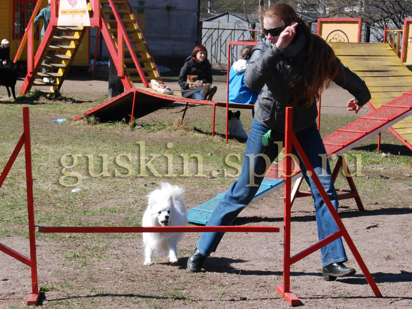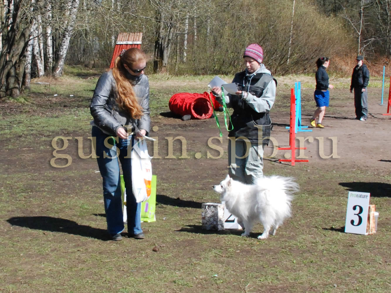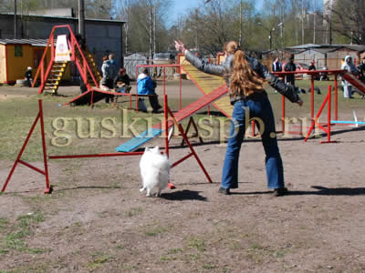 Потом начались соревнования. Правила были просты, как мычание: набрать за полторы минуты как можно больше снарядов, причём самыми «дорогими» были бум и качели. Правильная тактика — как можно быстрее протащить собаку на поводке по буму и качелям как можно большее число раз. Было действительно весело, тем более, что большинство выступающих в категории small были со шпицами. Все хлопали и поддерживали друг друга. По окончании соревнований дебютантов все участники получили дипломы и подарки — вообще, организаторы очень старались, чтобы обстановка была душевной, я думаю, это все почувствовали (даже Слава, который в сторонке читал Пушкина).