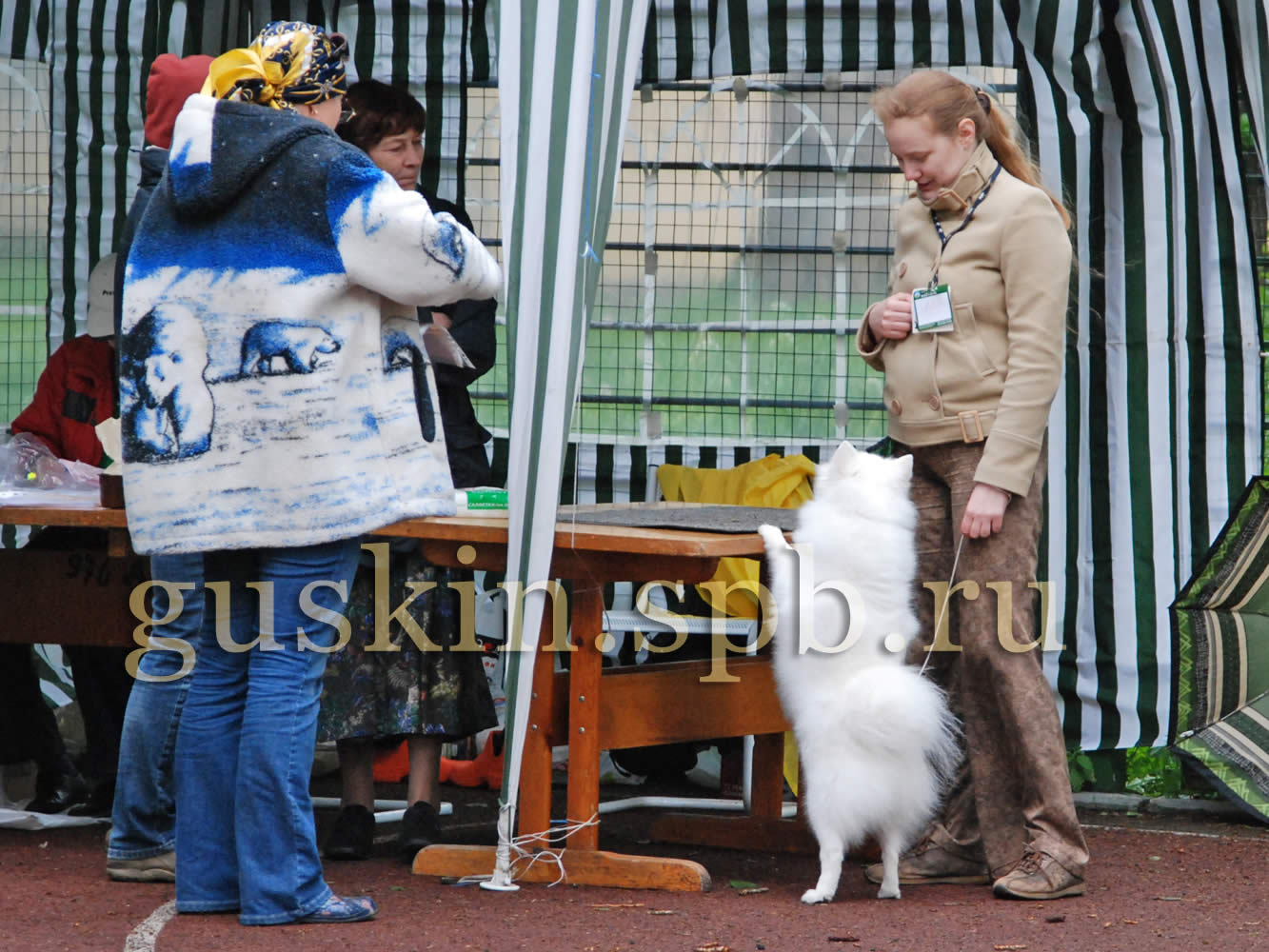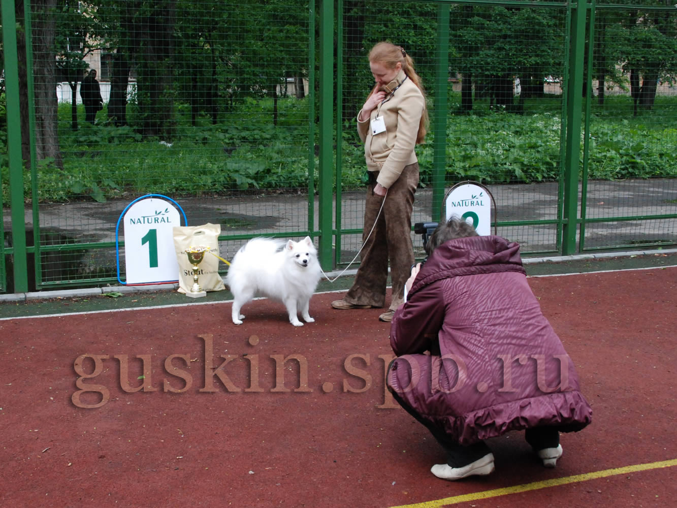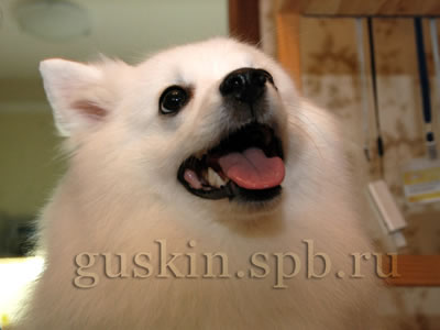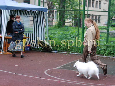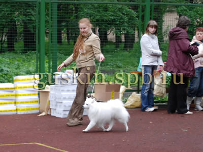 Расшалилась, стала требовать, чтобы такую красивую собачку кормили вкусненьким и оказывали знаки внимания. Со временем, конечно, притомилась, да и разочаровалась в нас и улеглась спать, а мы всё переживали, что пол не мыт, как бы Белочка не стала пыльной. Выставка проходила спокойно и приятно, только волновал время от времени начинавшийся дождик. Японский шпиц был ровно один, так что ЛПП мы получили на халяву. Однако без приключений не обошлось: эксперт первым делом указала мне, что Белка в ложняке. А я по неопытности это прощёлкала. Я была поражена: как, это же моя собака, а я проглядела ложняк! Однако эксперт, конечно, была права. Как всё-таки полезно ходить на выставки! Я бы так ничего и не заметила, скорее всего... А в целом Белка понравилась. Удивилась, что судья несколько раз повторила «отличная психика». Редкость. Белка, конечно, умница, и вела себя отлично, только почему-то отвлекалась на собак больше обычного. Приходилось напоминать ей, что у неё ложняк, а не течка. Нам дали причитающиеся призы, но среди них не было кубка: ведь Белка была одна в породе, не давать же ей всё то же, что и миниатюрным шпицам, которые выигрывали ЛПП в большой конкуренции. Однако Белка явно считала, что достойна большего, и зачем-то лезла через стол к ринговой бригаде. Хотела всё-таки кубок. Я очень серьёзно объяснила Белке, что кубка не будет, зато могу дать вкусняшек. На самом деле, я вообще не пошла бы на бесты, если бы они не начинались сразу же после нас (японские шпицы обычно в конце каталога — по алфавиту). Ну, может, и пошла бы, не стоит так уж загадывать. Но я, конечно, не могла ни на что особенное рассчитывать, куда нам, представлявшим породу в одиночестве.
