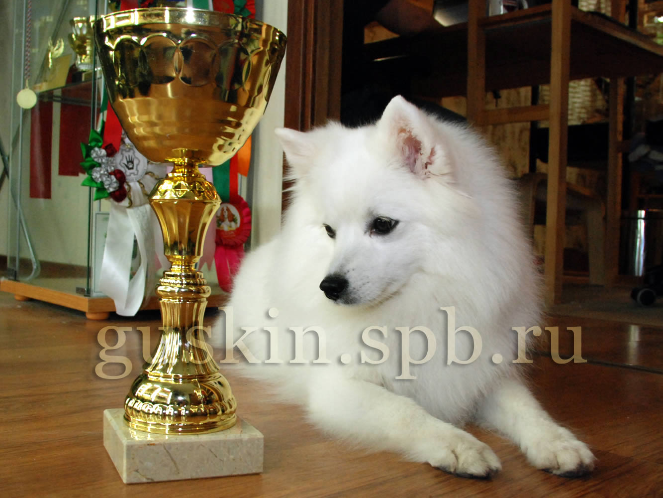 Как я уже говорила, кубок, полученный за бест на последней монопородке, оказался самым большим (хотя, может, и не самым роскошным) в Белкиной жизни. К сожалению, он не маркирован (нет никакой таблички с пояснением, где, когда и за что). Кстати, и розетки выдавались только с самыми нейтральными надписями, а всегда так приятно получить кубок или розетку с надписью Best in Show...