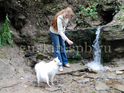 Главная достопримечательность Изборска — Словенские ключи, куда мы немедленно отправились. Это настоящие водопадики, бьющие из обрыва; очень красиво. Вода замечательно прозрачная. Народу было довольно много, но и мы со Славой, и Белка сумели и пофотографироваться, и походить (побегать, попрыгать) по камням, и попить водички. Ключи сливаются в Городищенское озеро, по которому плавали лебеди, но лебеди Белку совершенно не заинтересовали. Она с удовольствием прошла по мосткам (привычное развлечение), но как Славка ни тыкал пальцем в лебедей, внимание на птицах не фокусировала. Её больше интересовало, чего это я не пошла со всеми, а осталась фотографировать. Потом мы вернулись в крепость и попытались посадить Белку под арест, но она не посадилась. Всё-таки мало я её раскормила. Между прочим, по стенам крепости ходить запрещено, но Белка всё-таки вскарабкалась по кладке повыше, обозреть окрестности. Иногда мне кажется, что у меня обезянка, а не собака. Маленькая такая обезьянка, белая и пушистая.