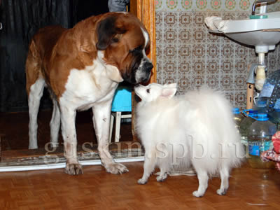 На Яшму же смотрела с подозрением и ждала подвоха. Она не знала: подвох в том, что к середине июля Яшма будет в два раза крупнее Белки. Зато Винсик повёл себя с Яшмой, как он обычно себя ведёт с маленькими собачками. На лице у него было написано настоящее умиление, только он очень боялся раздавить малышку. Надо было видеть, как старался он уследить за всеми своими ногами. По Белке-то он изрядно потоптался в своё время... Только после водворения Яшмы в вольер он почувствовал себя свободно.