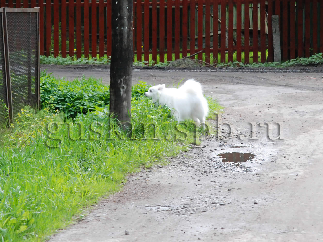 Но Белка очень быстро избавила меня от фотографических хлопот. В речке поднялась вода, да так, что у моста сбилась полоска грязной пены — вот в неё Белка радостно и шагнула. Собав на себя весь мусор, всю пыль и всё гадость, скопившуюся у моста. В одну секунду наша чемпионка превратилась в подзаборную шавку; выбравшись из воды, она ещё «вытерла» лапами морду — и остался от былой белоснежности только затылок.
