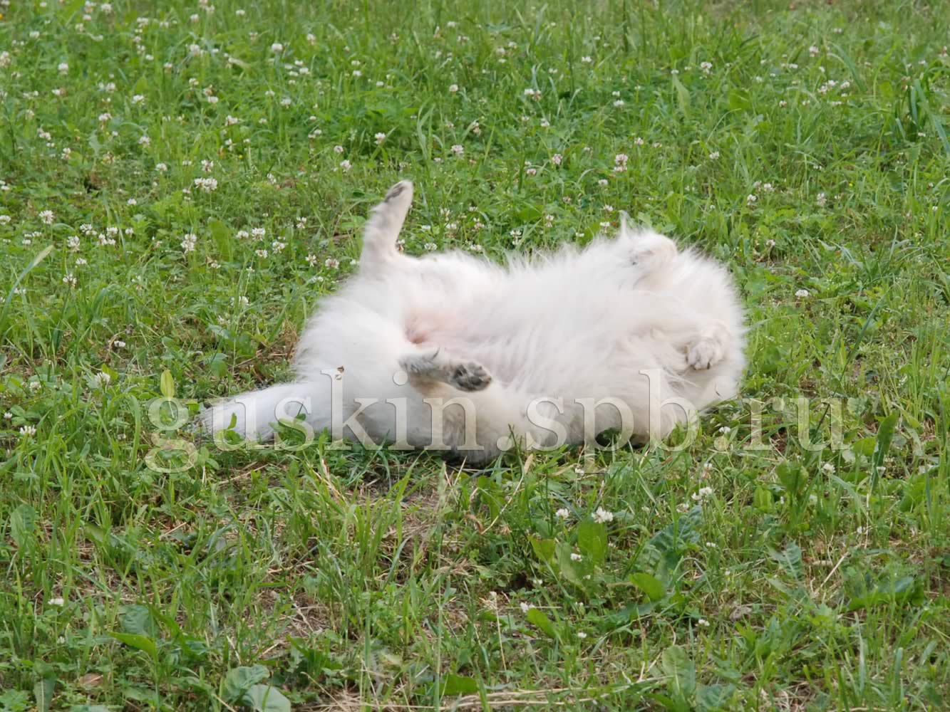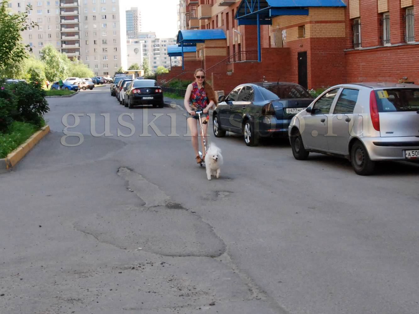 Поначалу Белка была далеко не восторге. Самокат — страшная штука, если подумать. Неустойчивая, нет-нет да и зашибёт маленькую белую собачку. И управляется неважнецки — ну как переедет пополам? В общем, Белка предпочитала держаться от этого механизма как можно дальше. Но бежала рядом хорошо, и даже научилась меня буксировать. Когда мы поняли, что у нас получается, стали выгуливаться в шлейке, но немножко катались и на ошейнике. На Белкином лице страх смерти постепенно сменился улыбкой. Мало помалу мы здорово насобачились выгуливаться на самокате; днём я выходила с работы специально на пробежку, и Белка, как мне кажется, бегала с удовольствием. Хотя, конечно, с ещё большим удовольствием она каталась по траве после пробежки. А потом забиралась на крыльцо у парадной и оглядывалась с победным видом. Но не думайте, что Белка так всё лето и каталась на самокате — нет! Ещё она ходила в гости и там покоряла четвероногих хозяев двора. И — по будням — на работу. И всё это — в то время как Винсик самоотверженно нянчил Яшму… 22 ноября 2011