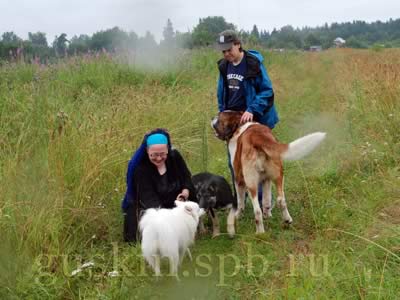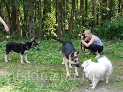 Часть первая Последние дни с Яшмой Время шло — не быстрее, не медленнее, а так, как этому времени положено идти. Час отъезда Яшмы домой, в Финляндию, приближался неуклонно. Мы с Надеждой, хозяйкой Кабиры, решили напоследок побаловать себя и собак совместной прогулкой. Гулять отправились в Юнтолово, рядом с домом Кабиры. Яшма сказала, хорошее место. Главное, много грязной воды в наличии! Кабира, которая, говорят, по молодости была та ещё хрюшка, явно пыталась как-то откреститься от дочки-грязнули. При этом сама Яшма считала, что мама должна быть в восторге от её поведения. Только выбираться на берег трудновато маленьким собачкам — а мать почему-то не помогает... В общем, пока добрались до фотосессии с мамой, Яшма уже извозилась по уши. Ясно, Кабира держалась от неё подальше... Хотя сделать вид, что она тут ни при чём, всё равно не удастся: сходство-то налицо... то есть, наморду... А самое забавное, что Белка тоже извалялась. Конечно, случайно: пошла попить и провалилась... ну, как всегда, вы поняли... Надежда фотографировала Яшму, хоть это было дело непростое: фотоаппарат ужасно интересный! Мы тоже сделали ещё несколько чумазых портретов. Яшма была фотомоделью, затворы фотоаппаратов щёлкали ежесекундно. Уж и так её наснимали, и этак... Хотелось сделать хорошие кадры в движении. У Яшмы прекрасные движения, но как поймать момент? Я пыталась побегать с ней по кругу; получилось так себе. А как зафотать стойку, если она беспрестанно крутится? И руками не очень-то удержишь... В общем, вернулись к групповым снимкам... они хоть как-то получались... Белка поначалу пристроилась поодаль от двух буйных овчарок, но потом потихоньку подползла. А Яшма, наоборот, всё время куда-то уползала. Или, по возможности, убегала. Ну как можно усидеть на месте, когда ты овчарка и тебе всего четыре месяца? Правда, со Славой Яшма ещё как-то сидела. Она вообще очень полюбила Славу и старалась держаться к нему поближе. Тут в кустах кто-то зашумел — и нам удалось запечатлеть очередную «почтистойку». В общем, программа-минимум по фотографиям была выполнена. Яшма, как могла тепло, попрощалась с Кабирой и Надеждой — предполагалось, что они уже не увидятся до её отъезда в Финляндию, поэтому ей всячески желали счастливого путешествия...