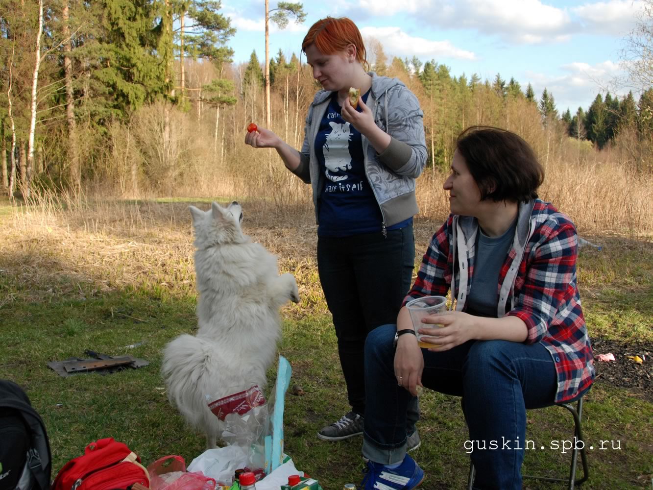 Среди сенбернаров она совершенно как своя. Не знаю, что об этом думают сенбернары, но Белка в этом уверена. Встретили бульдожика... а вот это не свой человек, а какая-то непонятная зверушка. В общем, очень удачная прогулка. Что может быть приятнее прогулки с сенбернарами? Шашлык! Достаточно просто приехать на шашлычное место, без всего — Белочка быстро найдёт, чем себя занять. Времени она не теряет, всё время в поисках. Ну и положительные подкрепления буквально повсюду. Даже если нет шашлыка, можно что-нибудь клянчить. Например, помидорку. Когда начинает доноситься аромат шашлыка, Белка перестаёт шариться по окрестностям и занимает стратегическую позицию поближе к столу. Ну а там уж точно с пустой пастью не уйдёт: всегда найдётся слабое звено... И среди собак, и среди людей Белочка — маленькая принцесса. И мир к её услугам. 29 июля 2015