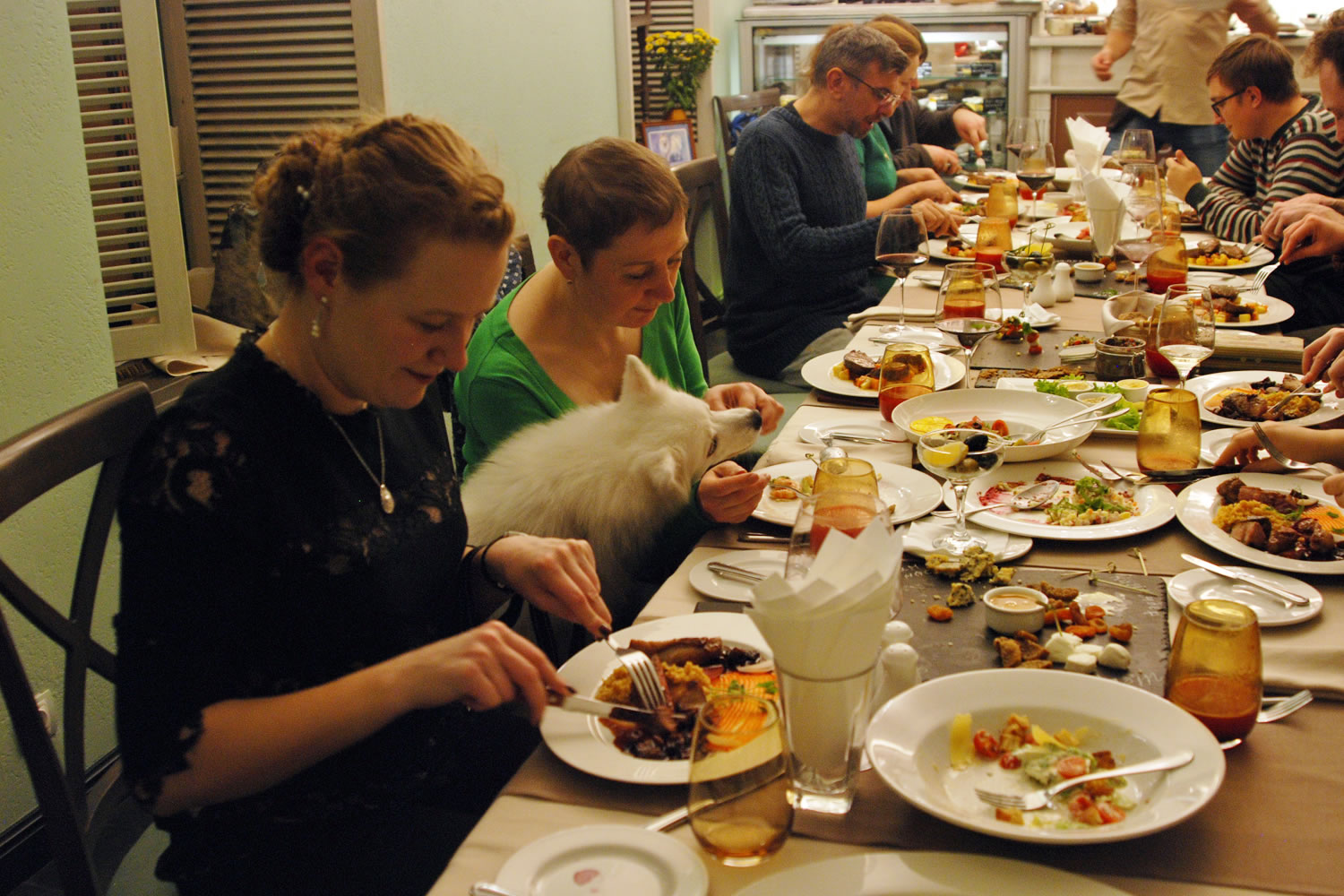 Часть первая Юбилей Бельчонка 10 лет — это для кого угодно не фунт изюма. Поэтому к юбилею любимой собаки мы подготовились очень основательно. Купили голяшку — Белочке погрызть. Раньше такие ей доставались только после Винса, а тут своя, личная! Для Стрелки тоже была куплена косточка побольше, ведь она была приглашена на именины. Собаки напряжённо ждут, пока подарок приготовят. Именинница в нетерпении... И вот наконец-то! Наша заслуженная юбилярша с подарком! А потом мы пошли в ресторан и пригласили всех Белочкиных друзей. В ресторане собралась большая компания. Белка поначалу приветствовала всех входящих, но постепенно совсем ошалела от обилия людей и, главное, еды. Предполагалось, что у нас будет отдельная комната, но на месте выяснилось, что она отделена от основного зала не дверьми, а занавесом. Ну и, конечно, Белка тут же просочилась за занавес и пошла дружить со всеми посетителями. А потом сориентировалась и вообще пошла на кухню. Там воздух лучше. Пришлось собак взять на поводки, что, конечно, было не очень удобно. Впрочем, и в нашем зале Белка была не обижена разного рода ништяками. Многие не видели её несколько лет — и встреча была очень тёплой. Собак пришлось караулить Славке, конечно. Для следующего юбилея надо всё-таки будет целиком ресторан снимать. Кульминацей торжества был специальный паштетный тортик — инициатива ресторана. Вкуснотища, наверное! Но Белка никому не дала попробовать. Когда угощение вынесли, Белочка сидела на коленках у Стаса Богданова, так что ему повезло поработать подставкой под тортик. Отлично посидели, пообщались, поели... Белка — настоящая звёздочка, душа компании! 10 лет! Столько всего случилось и не случилось за это время — с ума сойти! Даже удивительно сейчас вспоминать... Позравляю тебя, с юбилеем, моя радость! Долгих тебе лет! 12 июля 2018