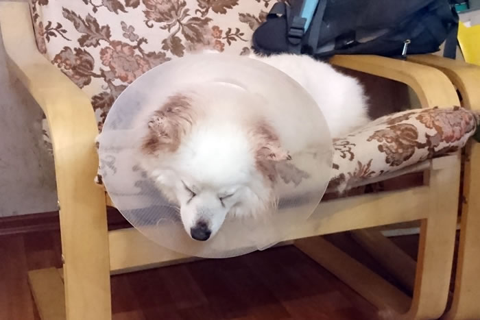 Через год случилась штука похуже: внезапно на Стрелку набросилась какая-то очень агрессивная аутоимунная дрянь. Вот только что всё было хорошо, вот собака начала чесать уши — а вот уже она вся в крови.