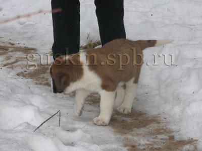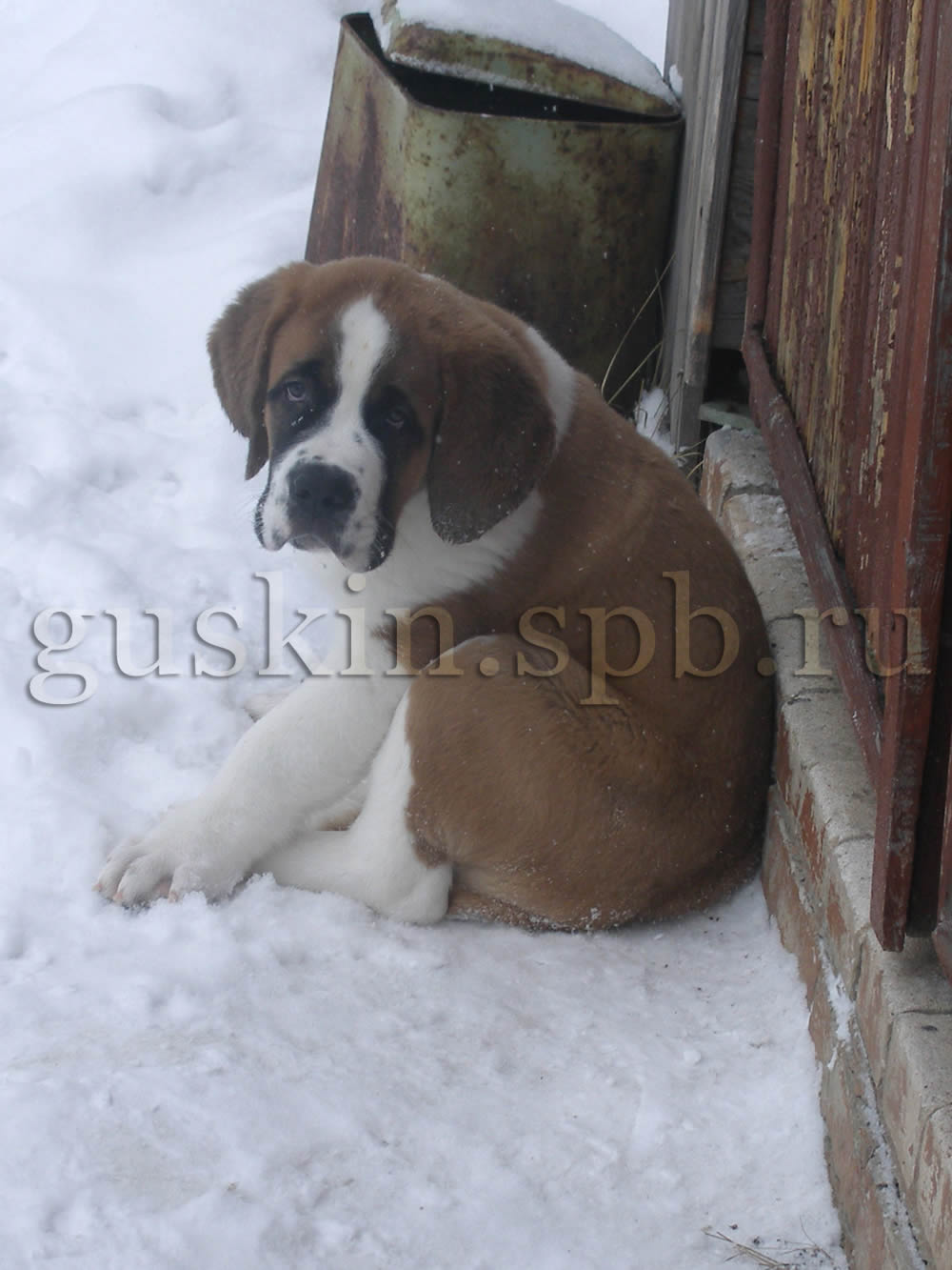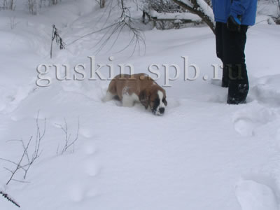 Первое впечатление Винсента Веги — испуг. До какого-то момента Винс очень боялся улицы. Мы ставили его на "чистый снежок", а он просто тихо приседал на пузо, стараясь не привлекать внимания Этой Ужасной Улицы. И носили мы Винса на ручках, чтобы он с высоты обозревал окрестности, привыкал, осваивался. Поставим — ложится. Видимо, нос не дорос. А потом — примерно в полтора месяца — просто встал и пошёл. Пора пришла. А потом — снег. Его сенбернарья стихия. По уши в снегу, с трудом вытаскивая из снега своё пухляшечное тельце — вот как Винсент гулял первый месяц. Мы нарочно заманивали или даже заносили его в снег, издевались, гадкие, но он не расстраивался — в снегу он был как бы на своём месте. Со временем обнаружилось, что Винс предпочитает опорожняться на ещё не топтаном клочке снега — бедный, думали мы, что же он будет делать, когда снег сойдёт?