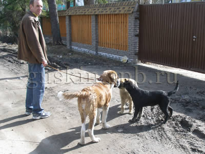 Часть первая: Как мы растём: на прогулках Прогулки на улице, с ошейником и поводком, начались для нас, конечно, после второй прививки. До этого за ворота Винс выходил, то есть, выезжал, только на ручках. А тут оказалось, что за воротами — другой мир! Вообще, гулять с Винсом — одно удовольствие. По сравнению с овчаркой, он на диво послушный, спокойный пёс. Он не бросается на собак, облаивающих его из-за заборов, не рвётся куда-то — не пойми куда... Что на поводке, что без него Винс ходит, в общем, как можно ближе к хозяевам — хотя ему тоже хочется иногда обнюхать что-то в стороне. Одно из главных удовольствий — познакомиться с другими собаками. Вот только никто не хочет с Винсиком играть — уж очень он большой... 12 мая 2006